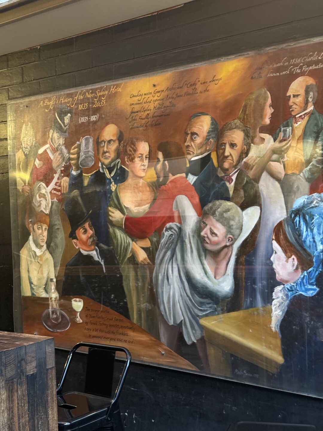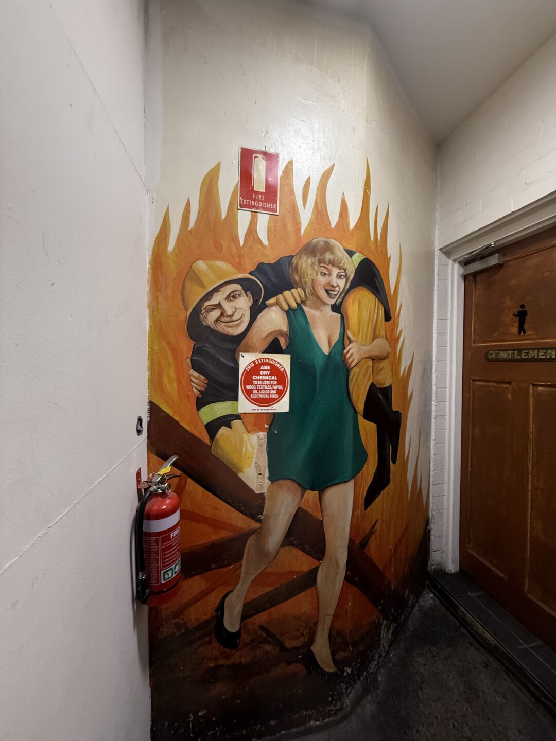 Inside, near the mens’ loo (and the fire extinguisher) a winking Hobart fireman is carried to safety by a laughing blonde. As a result, absolutely everybody who visits The New Sydney remembers where the extinguisher is.