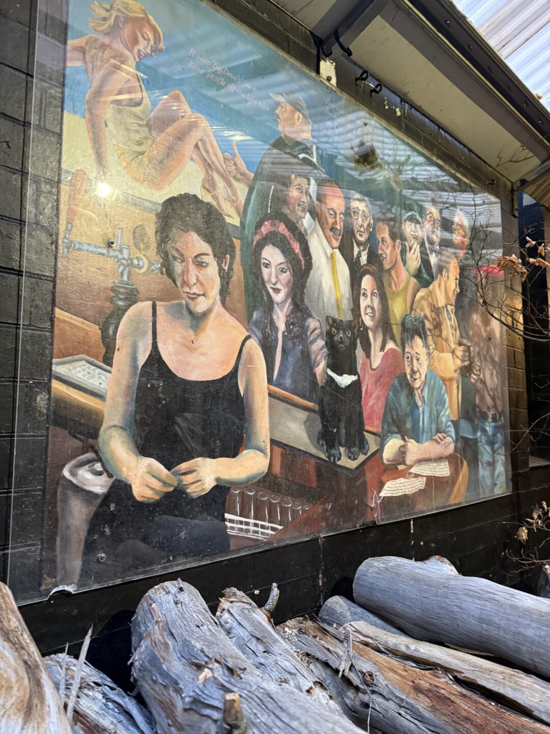 The logs for the fire are stashed outside in the beer garden, below the murals and hauled in as necessary (which is a lot, in a Tasmanian winter).