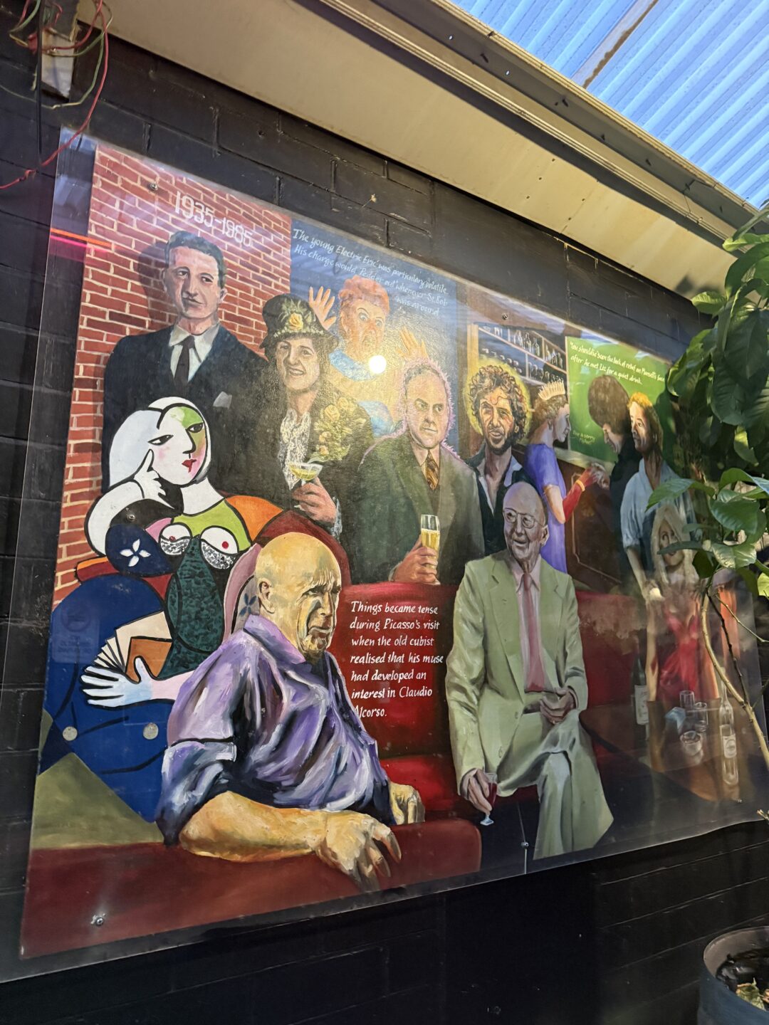 Wine legend Claudio Alcorso appears on the mural, with a modest glass of his own red, admired by a Picasso beauty.
